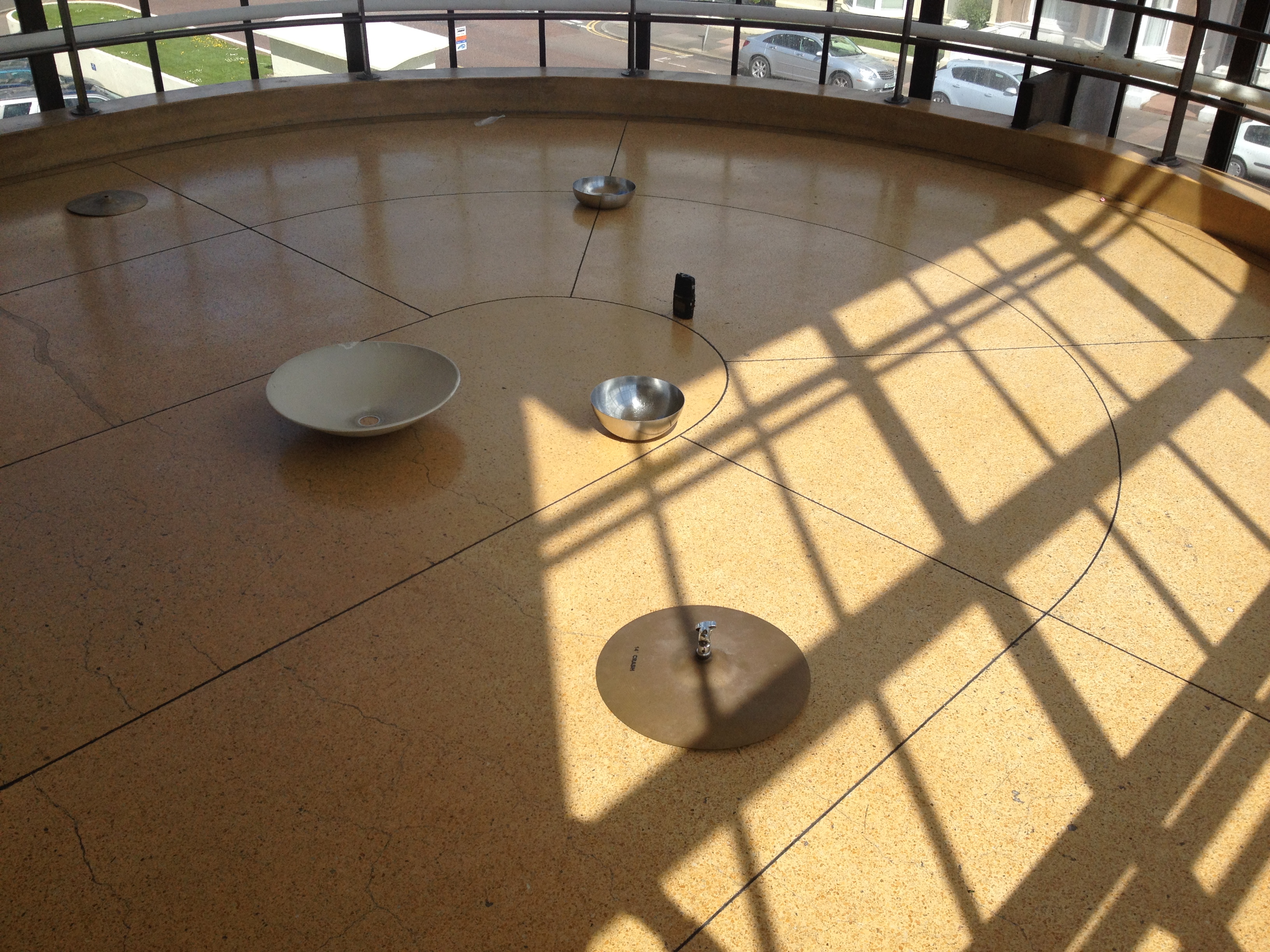 Yesterday Ollie and I spent the morning over at the De La Warr as part of our residency. We decided to spend a bit of time in the two front stairwells, Ollie brought a long a selection of Cymbals and metal bowls and some drum sticks! the stairwells are an excellent space with their own natural reverb, perfect for singing in! We created a number of improvised percussion pieces, and I was particularly interested in using the fixtures and fittings as ways of creating rhythmic patterns which proved to be extremely successful.